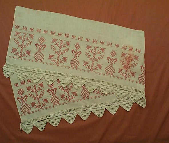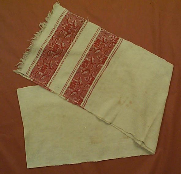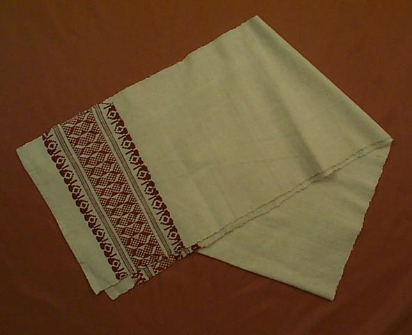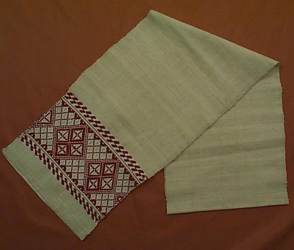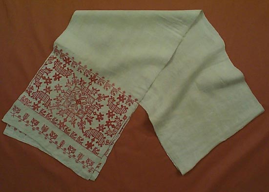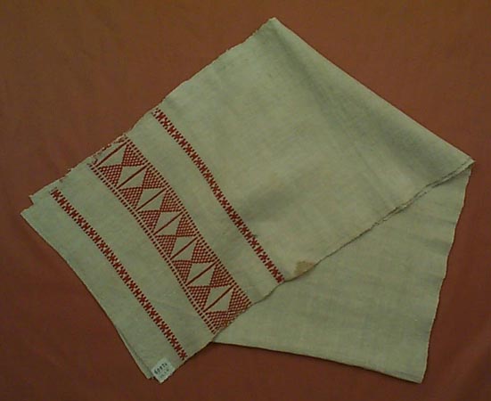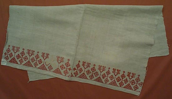 Фрагмент станушки. Кон. XIX в. р-н Олонецкий, д. Михайловское Лен, нить х/б. Ткачество домашнее, вышивка двусторонняя. 150 x 81 см.
