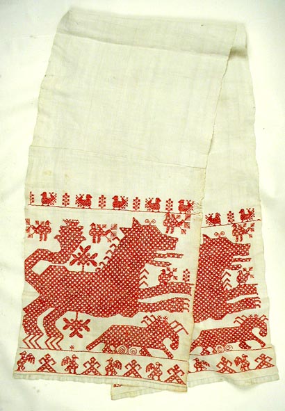 Полотенце. Кон. XIX в. р-н Олонецкий, д. Михайловское Лен, нить х/б. Ткачество домашнее, вышивка двусторонняя. 290 x 31 см.