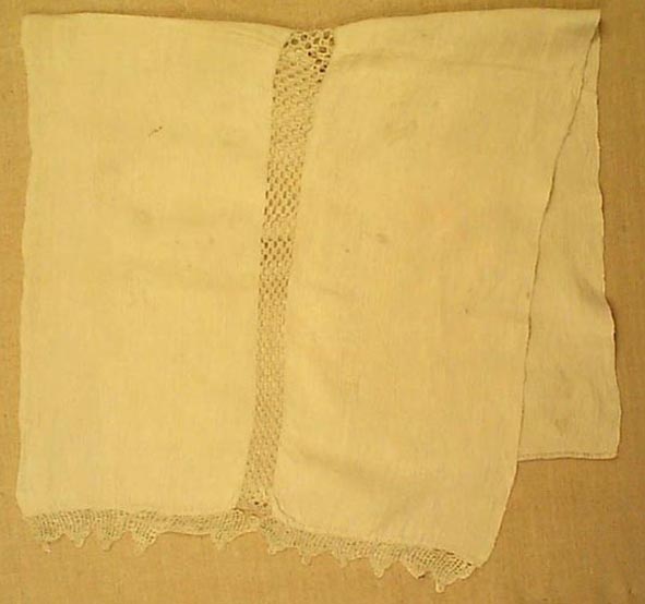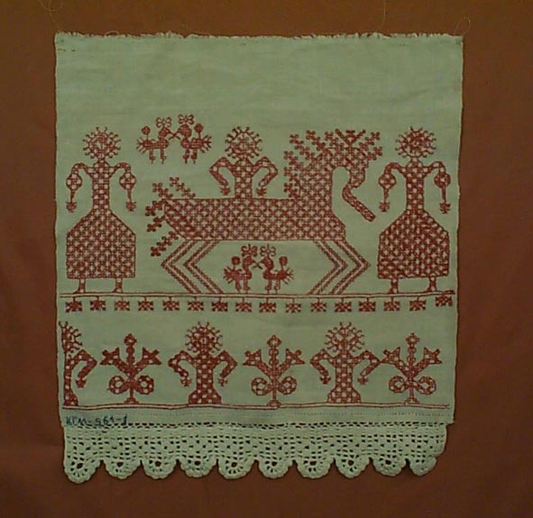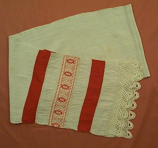 Станушка. Кон. XIX в. р-н Олонецкий, д. Михайловское Лен, нить х/б. Ткачество домашнее, шитье ручное, вышивка ручная. 62 x 59 см.
