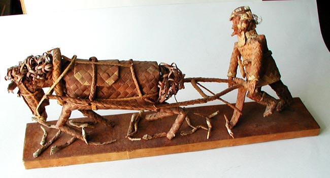 Костылев В. А. Скульптура "Илмаринен вспахивает змеиное поле". 1979 г. г. ПетрозаводскБереста. Плетение. 25,5 x 58 x 11 см.